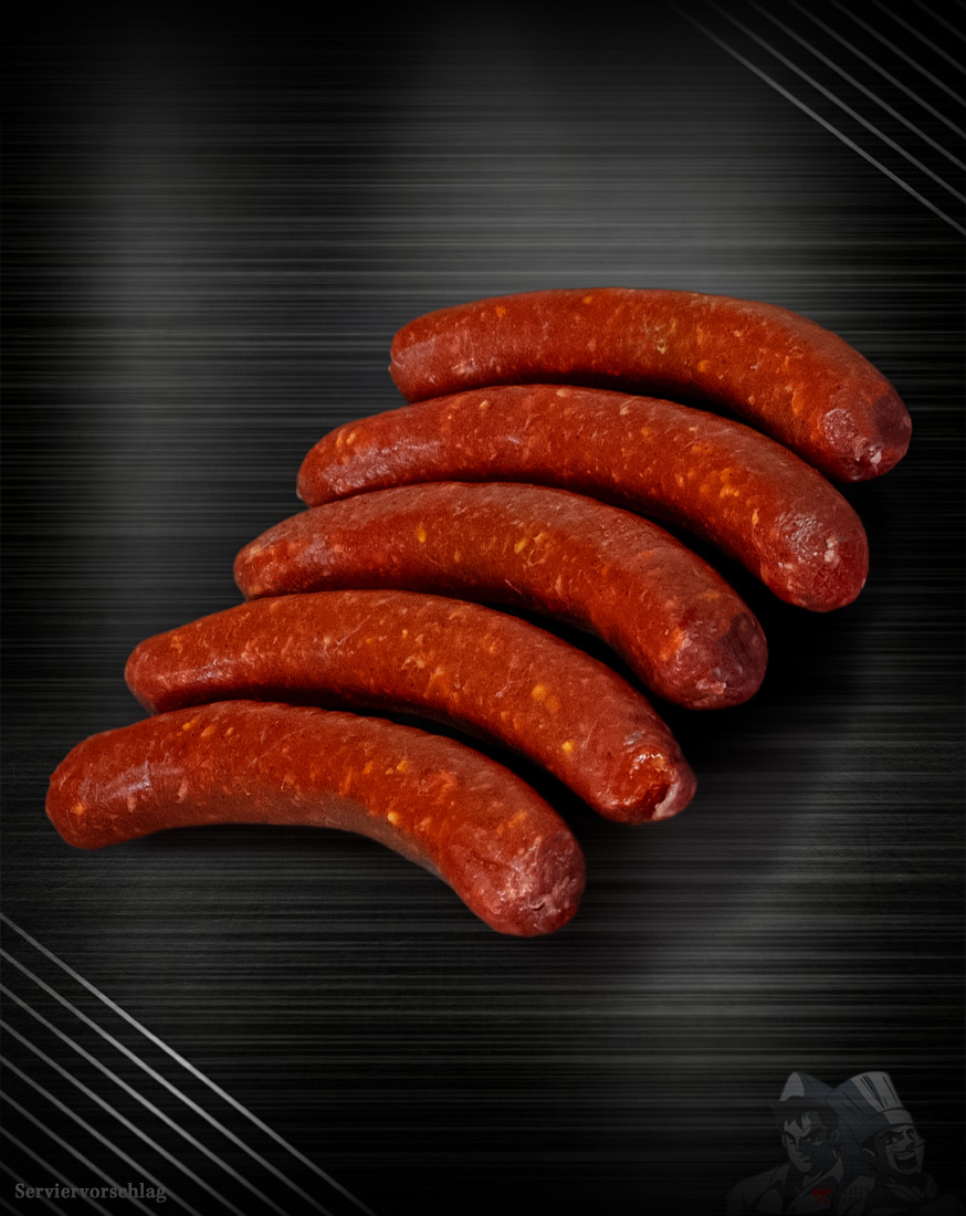 Die klassische Merguez stammt ursprünglich aus Nordafrika, wo Schweinefleisch traditionell nicht verwendet wird. Stattdessen kommt eine edle Mischung aus Rind- und Lammfleisch zum Einsatz – kräftig im Geschmack, dabei fein im Biss. Gewürzt wird sie mit Kreuzkümmel, Koriander, Paprika, Knoblauch und Harissa, die ihr den charakteristischen Duft und die rote Farbe verleihen. In unserer Manufaktur setzen wir bewusst auf diese authentische Rezeptur: kein Schwein, keine künstlichen Zusätze – nur ehrliche Zutaten, handwerklich verarbeitet.